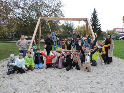 Große Freude herrscht bei den Kindern der Volksschule Baden-Radetzkystraße: Der Schulgarten hat eine neue Attraktion bekommen – eine Nestschaukel!